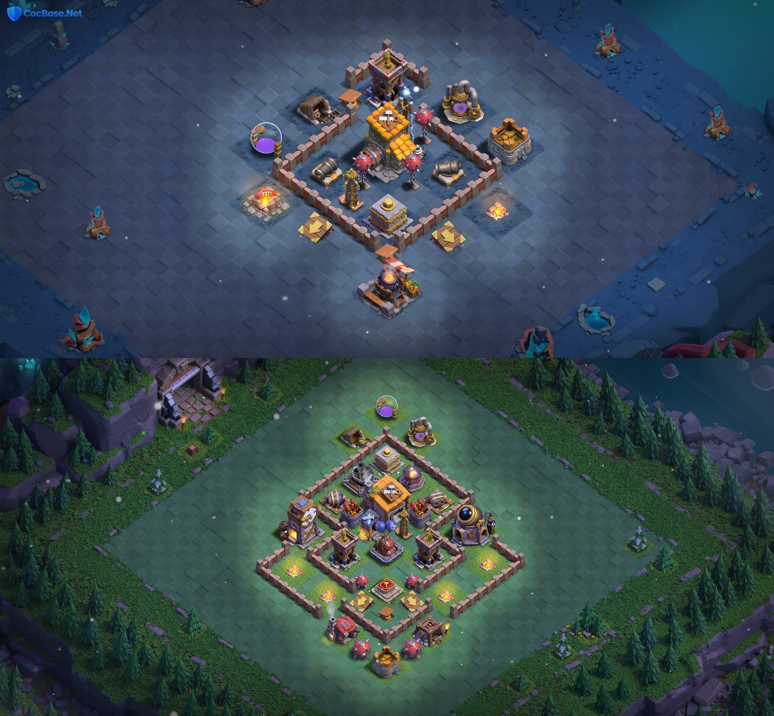 This Builder Hall 6 base layout is designed to funnel incoming troops into kill zones, taking advantage of the high damage output from the Multi-Mortar and the Double Cannon. The Archer Tower and Canon are placed in a way to provide supporting damage to the funnel, while the Builder Hall is protected by a layer of walls and traps.