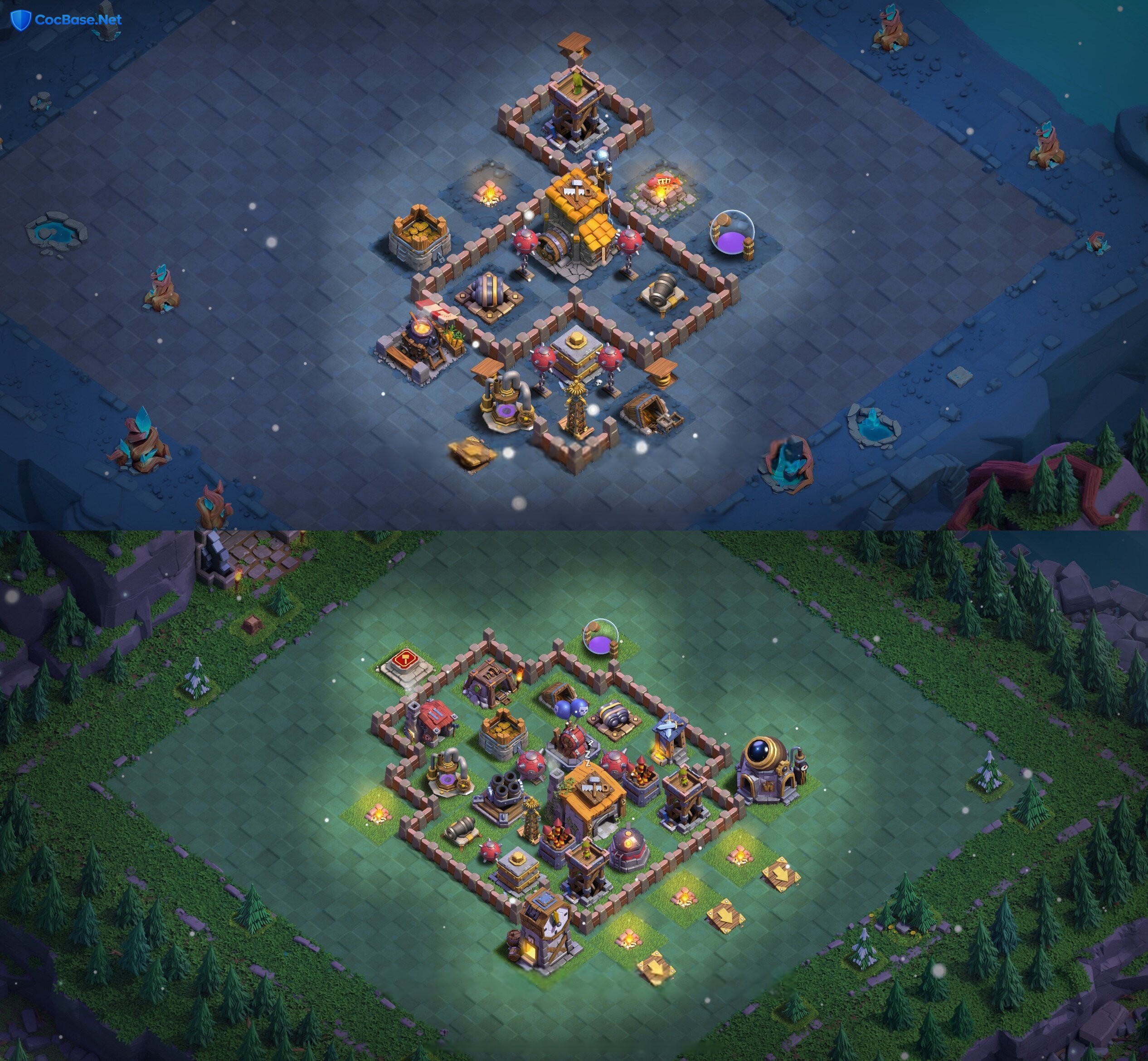 The core of this Builder Hall 6 base layout is designed around the strategic placement of the Mega Tesla, positioned to maximize its damage output against incoming ground troops. The Multi Mortar is placed in a way that it covers the entire base, providing a high level of protection against both ground and air attacks.